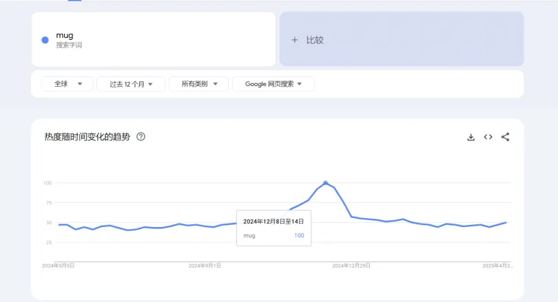 “Mug马克杯”全年的市场需求大、销量稳定,热度从9月上升,在11-12月圣诞节达到峰值,随后在2月情人节和5月母亲节再次出现小高峰。