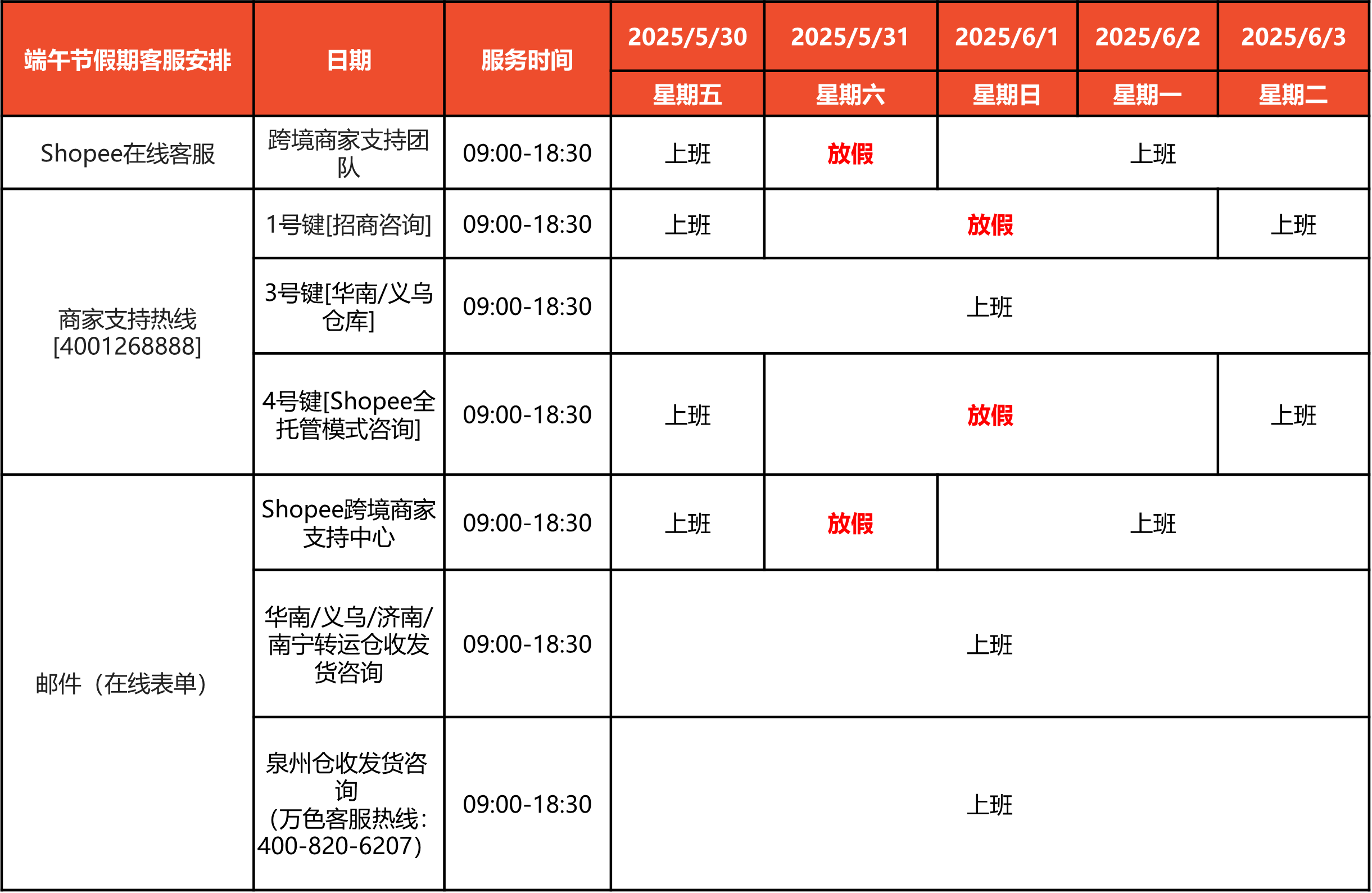 针对跨境订单(一店多运模式店铺跨境发货的订单):Shopee平台将在端午节法定假日豁免卖家2日物流时效,分别为2025年5月31日和2025年6月1日。物流时效豁免只针对发货工作日,自然日没有物流时效豁免。