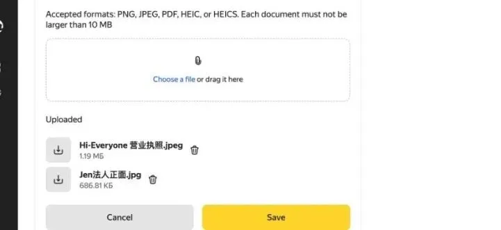 step13:上传资料-公司营业执照、法人正反身份证,单个文件不要超过1M , 照片要清晰,点击“Save-保存”。