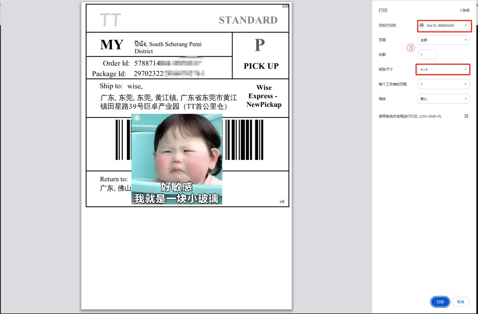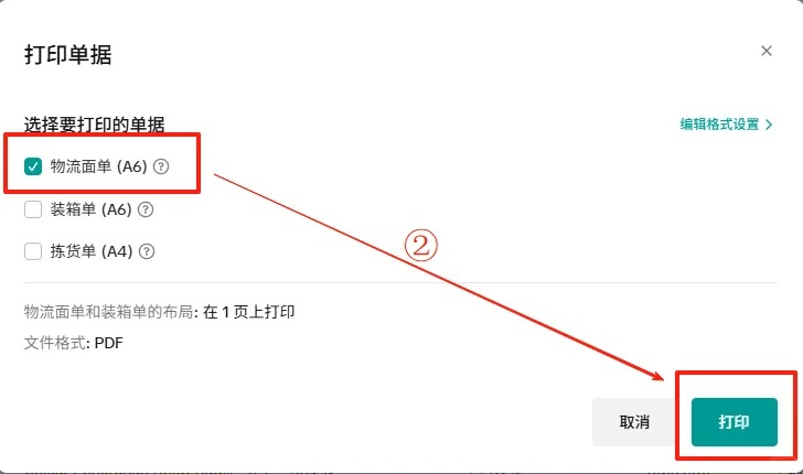 二、跳转打印面单时,选中打印物流面单,不用勾选装箱单或者拣货单,直接点打印