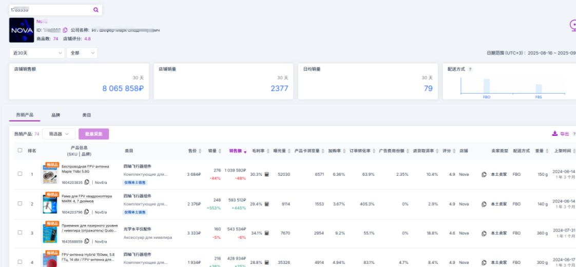 真正会选品的人,不止看单个产品,更会分析优秀店铺的整体布局。在Seerfar中输入店铺名称/ID,可以清晰看到其产品结构(如哪些是爆款、引流款、利润款)、热销品牌和类目分布,以及其上新频率与动销情况。