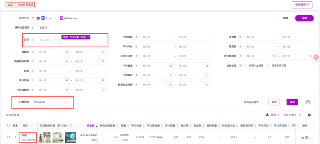 选品本质是“模仿—优化—创新”的过程。参考往年同期卖得好的产品,是被市场验证过的低风险策略。以“风扇”为例,在Seerfar中选择“热销类目选品-进阶”,设置时间范围为去年7月(或目标月份),即可分析历史销量趋势、热销属性、价格变化,为今年备货提供精准参考。