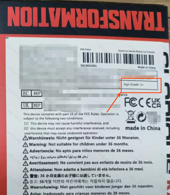 当【玩具-适用年龄信息】状态显示如上图所示“包装上存在互斥年龄信息”时,通常是由于商品标签上的适用年龄信息与商品年龄限制警示语中的信息相互矛盾。相关示例如下,仅供参考:
