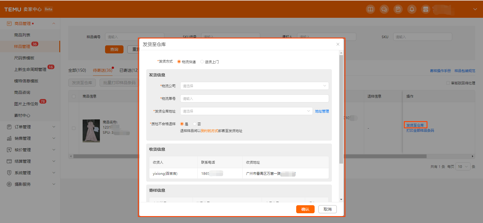路径:商家后台-商品管理-样品管理-发货至仓库