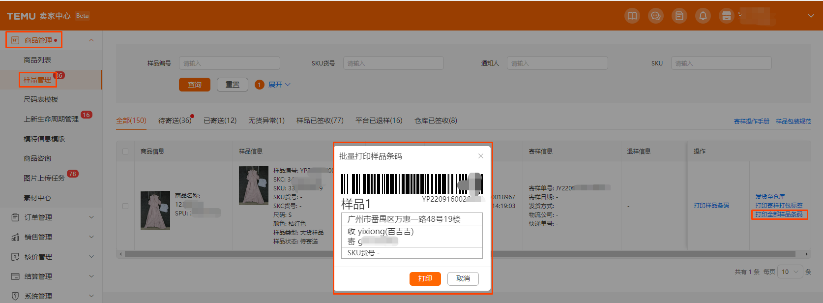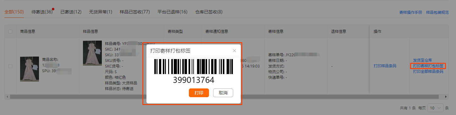 路径:商家后台-商品管理-样品管理-打印寄样打包标签