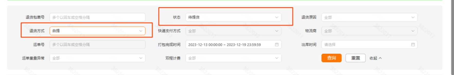 查询 【状态】为待提货且退货方式为【自提】的包裹(或按照退货包裹快递通知查询包裹号)