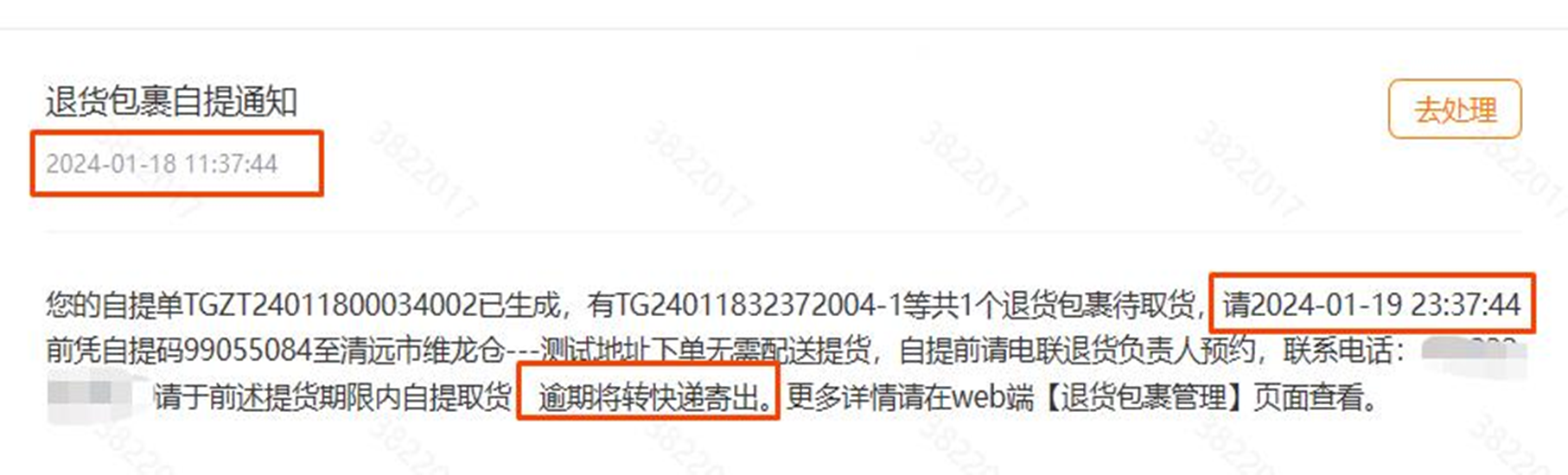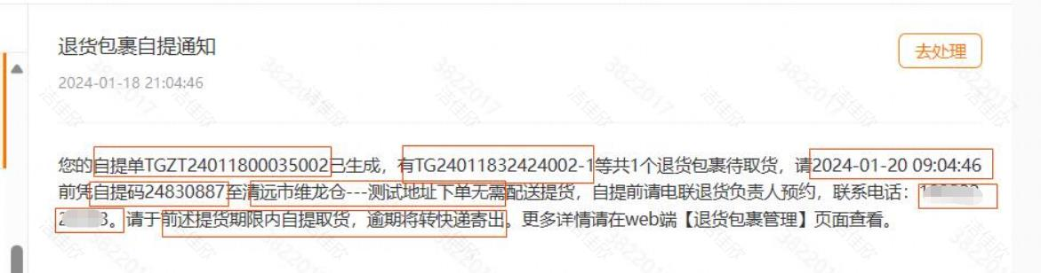 短信内容:自提单号、有效自提时间、自提码卖家中心-消息提醒:自提单号、包裹号、自提有效时间、自提码、退货子仓地址及联系方式、包裹逾期未自提的处理方式