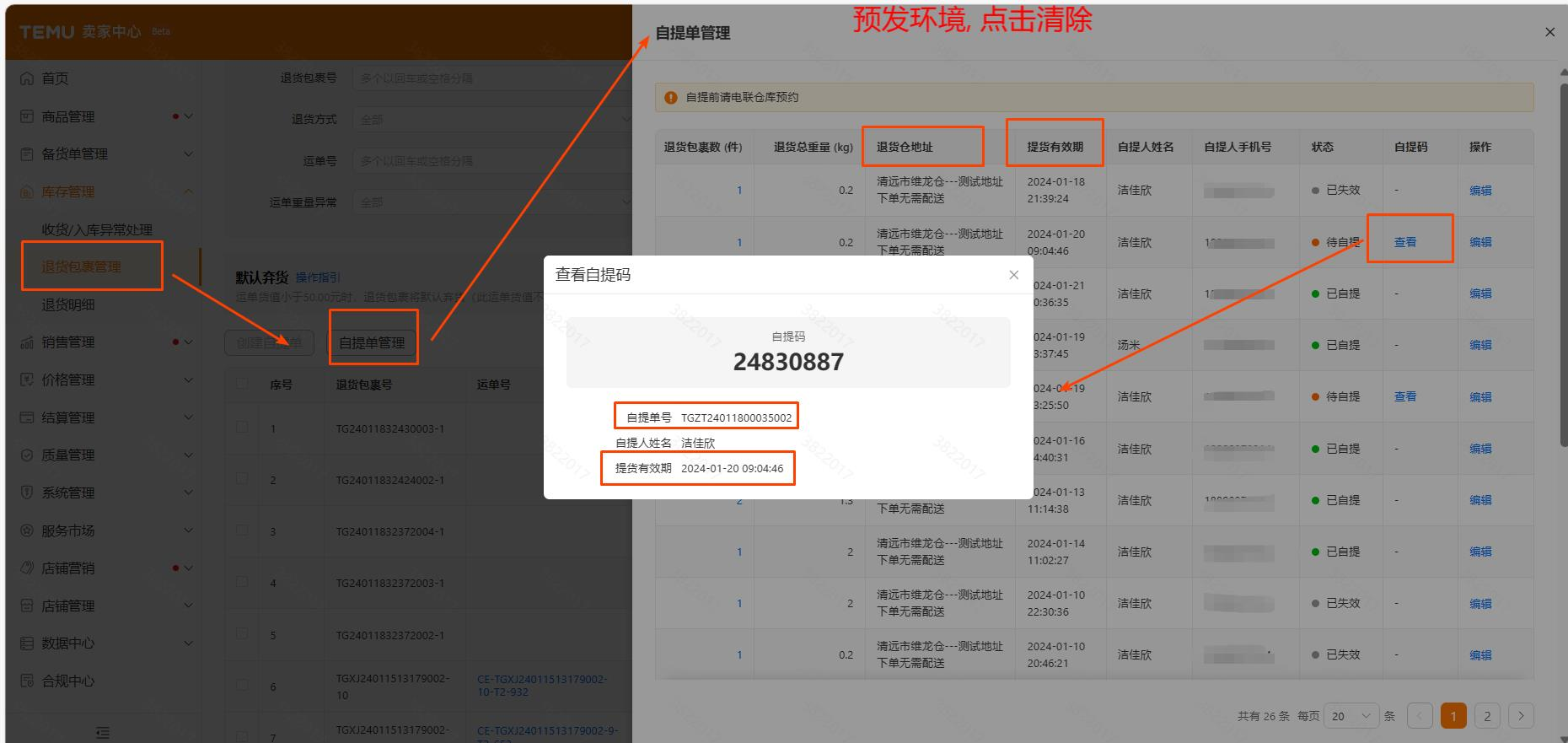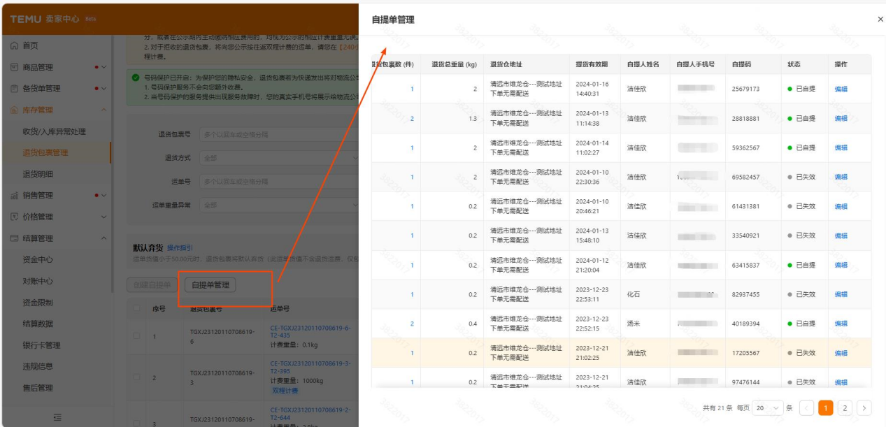 卖家中心-自提单管理:自提单号、包裹号、自提有效时间、自提码、退货子仓地址及联系方式