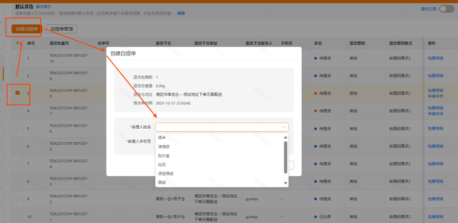 勾选需要自提的退货包裹号→点击【创建自提单】→下拉选择 自提人姓名