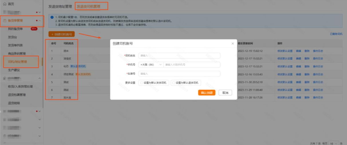 自提人信息来自:备货单管理→司机地址管理→发退货司机地址管理