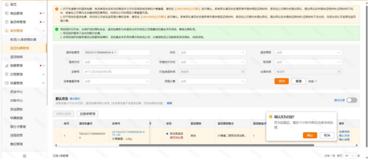 初始退货方式为自提的包裹,超时未来自提,包裹出库方式转快递,但在仓库未下单前,商家仍可在卖家中心选择弃货。针对拒收的包裹,若商家选择自提,则自提期限为成功创建自提单后72小时内,若自提期限内未完成自提,则视为商家同意弃货并由仓库自行处置。