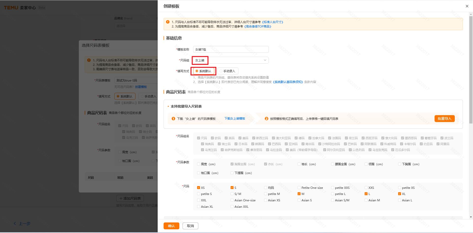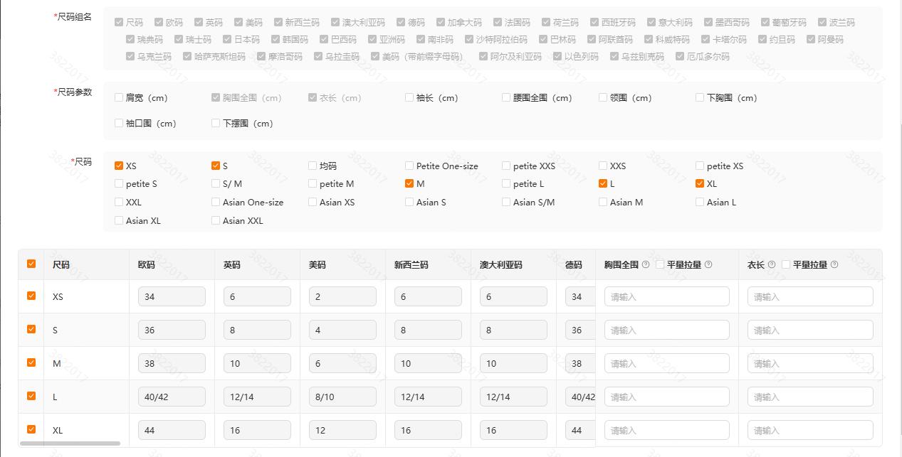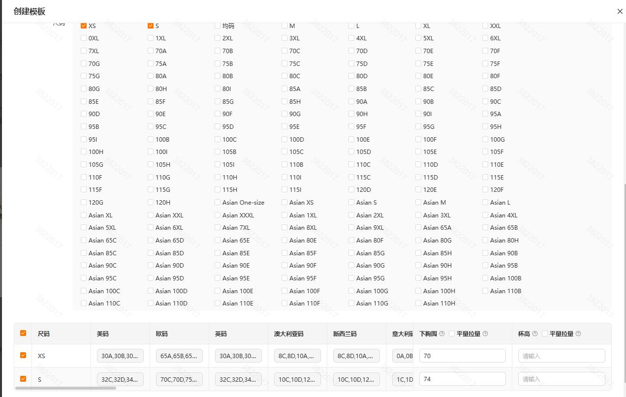 卖家选择对应的尺码模板,系统会自动填充已勾选了的XS、S对应各国家/地区尺码映射的关系