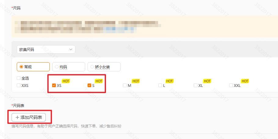 根据商品需要选择【尺码组名】,选择好尺码后,系统会自动映射出已勾选了的【尺码组名】对应的尺码,映射关系可以手动修改,尺码参数列需手动填充