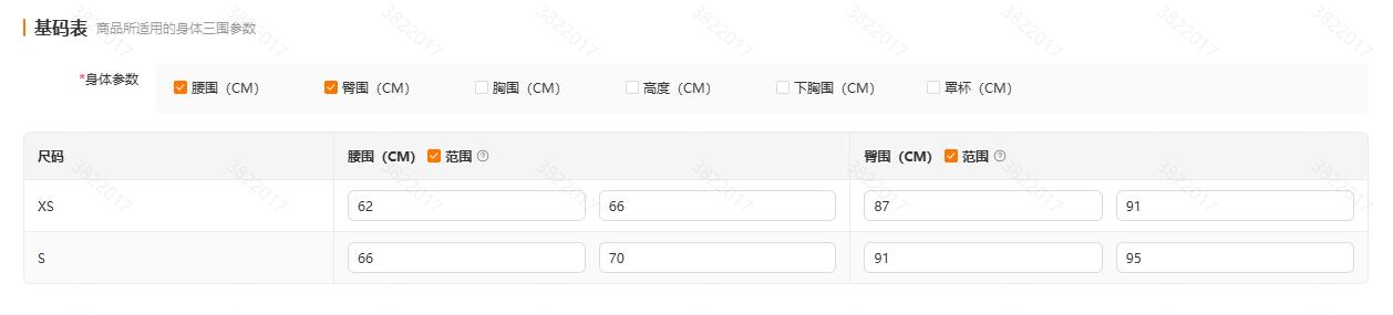 【基码表】填写,根据需要,勾选身体参数,身体参数列勾选范围,数值则可以填写范围值,否则只能填写一个数值。