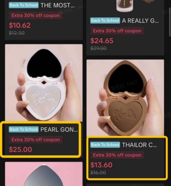 仅当您设置的 “活动销售价” 低于零售价时,才会显示下划线价格。在下方图片中,左侧商品未显示下划线价格,因为其设置的 “活动销售价” 与零售价相同;右侧商品因设置的 “活动销售价”(13.60 美元)低于零售价(16.00 美元),故显示下划线价格。优惠券将基于 “活动销售价”(13.60 美元)抵扣。