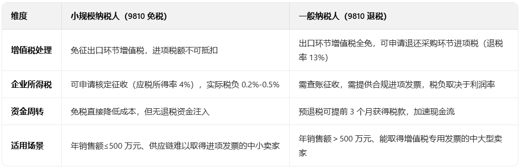 无需一般纳税人资格:小规模纳税人可直接适用 9810 免税政策,无需转为一般纳税人。