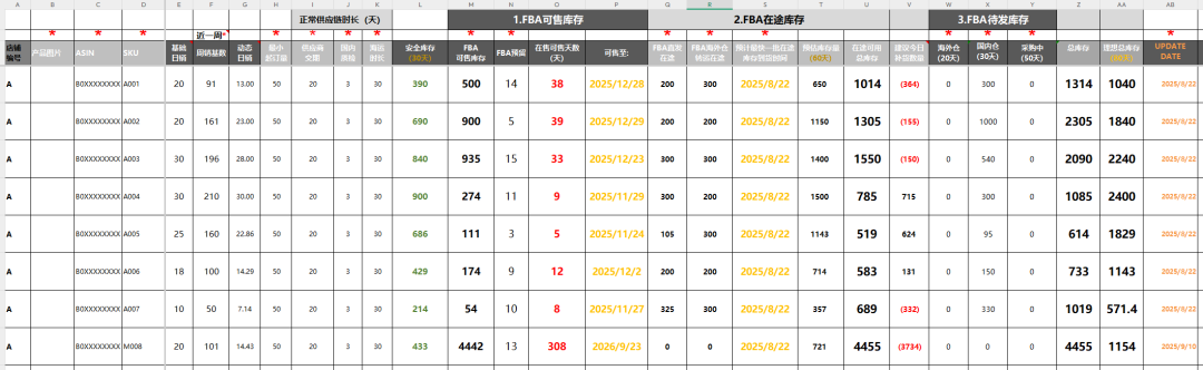 - 示例:日销50单,FBA库存需≥1500件;若广告加码至日销80单,则需≥2400件。
