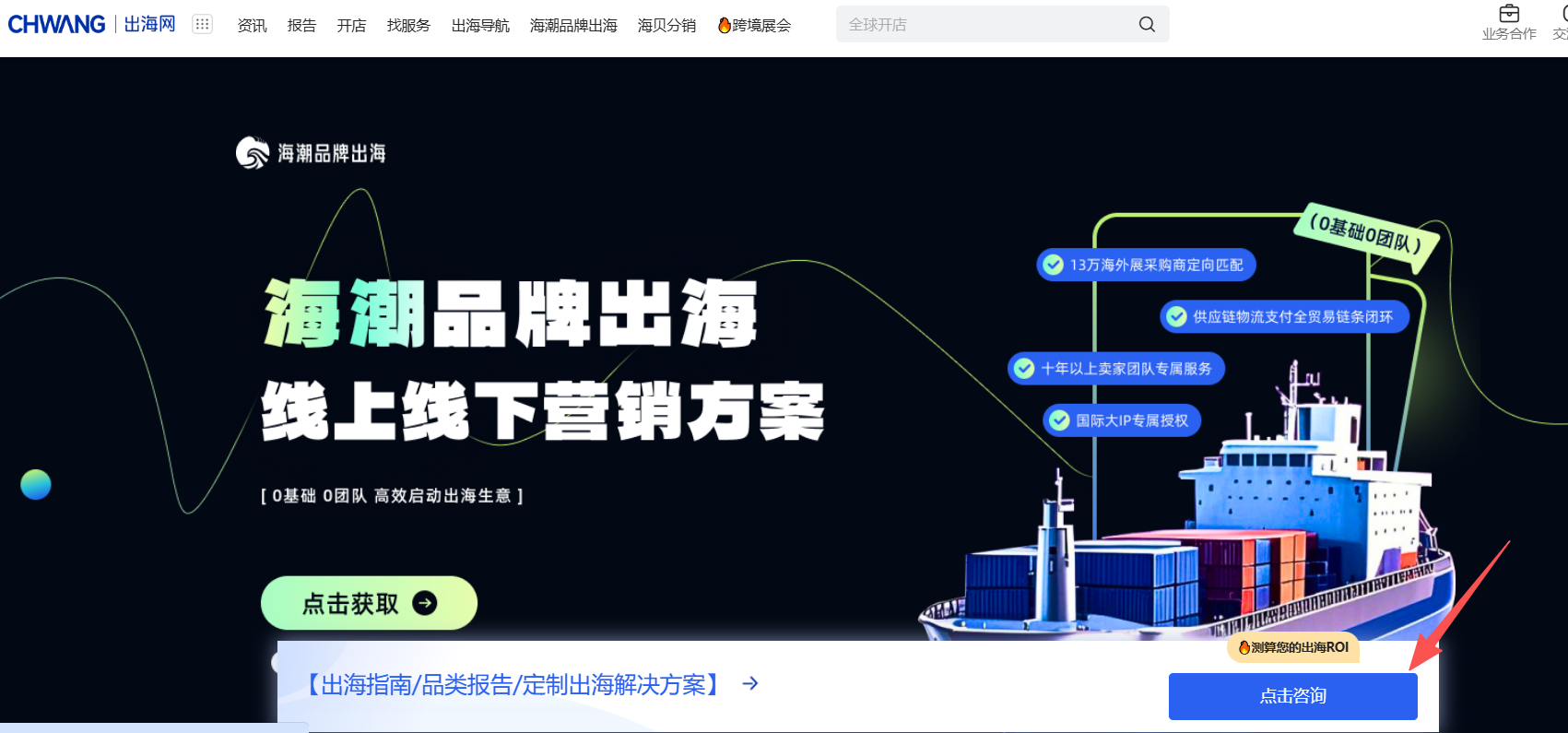 访问海潮品牌出海平台页面(https://www.chwang.com/p/haichao),点击“咨询”按钮,填写出海意向登记表,即有专属负责人与您联系。