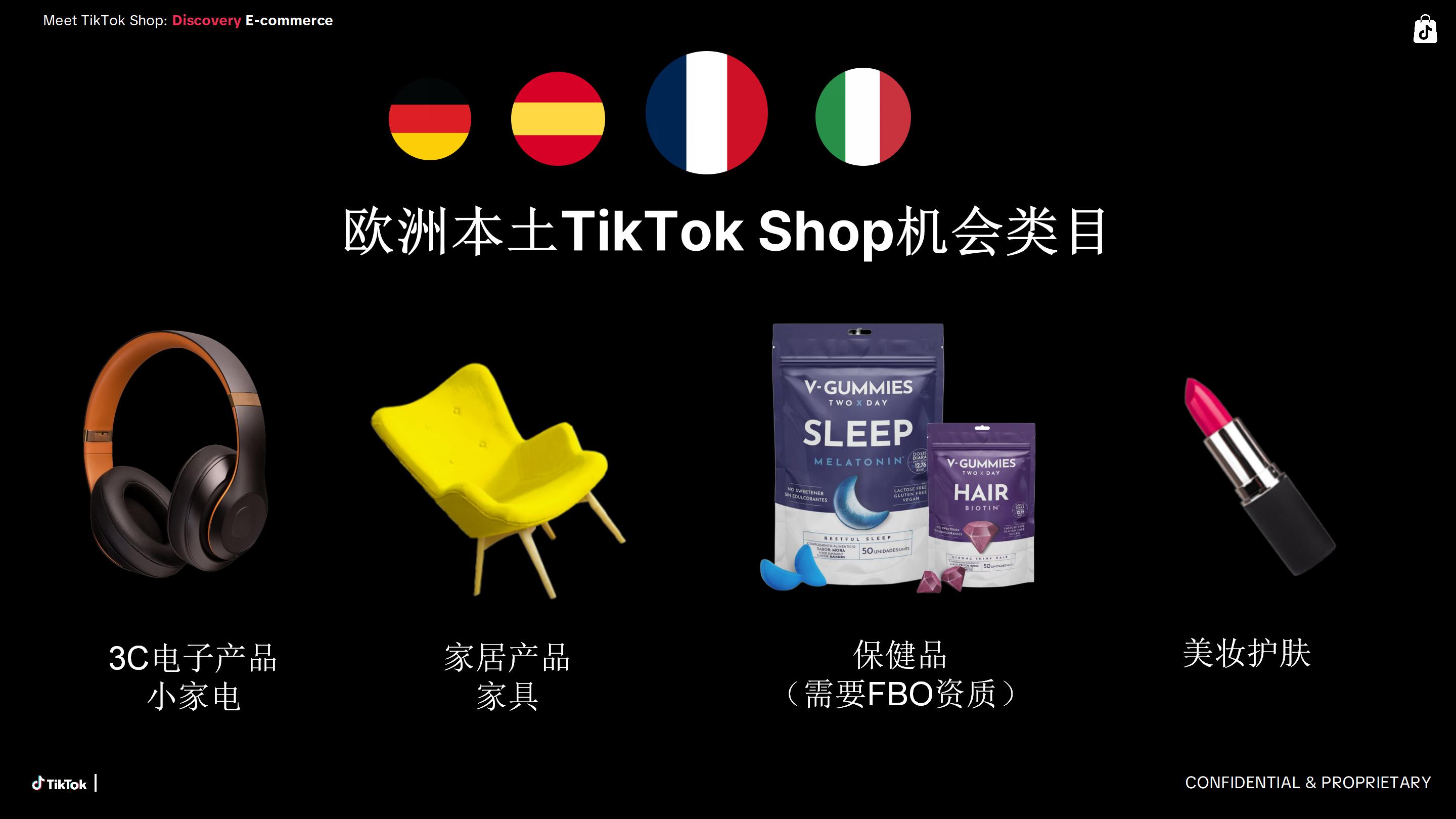 欧洲本土(覆盖德国、西班牙、法国、意大利)TikTok Shop 的机会类目如下: