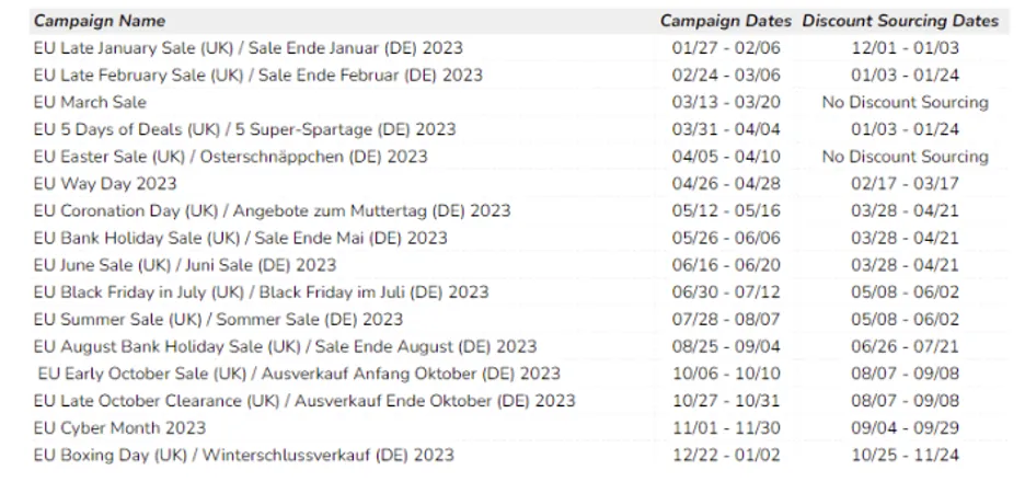 4.从促销上而言,季节变化、假日出行影响了消费习惯,需要供应商提前做好热卖品的备货与估算。欧洲有许多不同的促销需求,在此附上欧洲促销日历,请欧洲供应商按需提报,未雨绸缪: