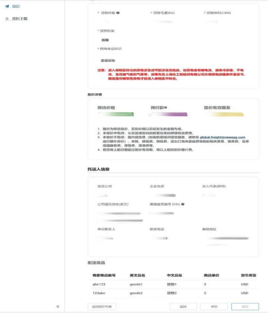 若您非SBN或3PL客户,无寄件单据编号,需填写货物详细信息。