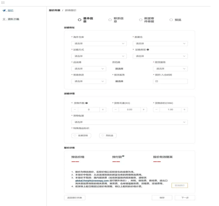 进入获得报价页面后,您需要继续填写出运订单的详细分类信息,以便获取预估报价。