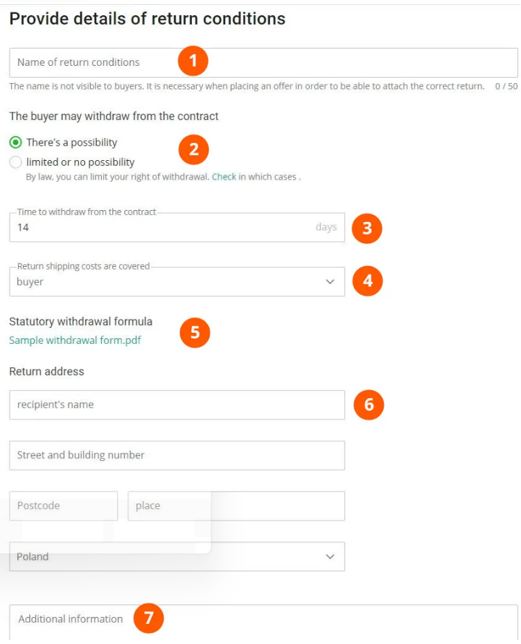 退货地址——如果您的公司不在波兰,请更改为您公司所在的国家。