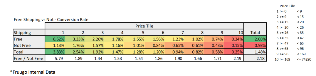 物流价格对客户行为有明显影响,产品包邮有助于提升转化率。Fruugo内部数据显示,包邮产品的转化率是不包邮同类产品的两倍。如果是低价值产品,包邮产品的转化率则高达不包邮同类产品的5倍。