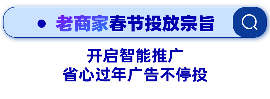 对于老商家而言,假期出单不停歇,借助春节流量持续导入店铺,在春节期间稳中求进是最好的结果。稳定店铺流量输入,需要避免店铺停投后的断崖式下跌,商品停投后节后重新获流冷启动不利于大促前的流量竞争。此外条件允许的话,需要商家开启智能推广计划,提前设置好预算,借助假期的机会点占领更多流量资源。