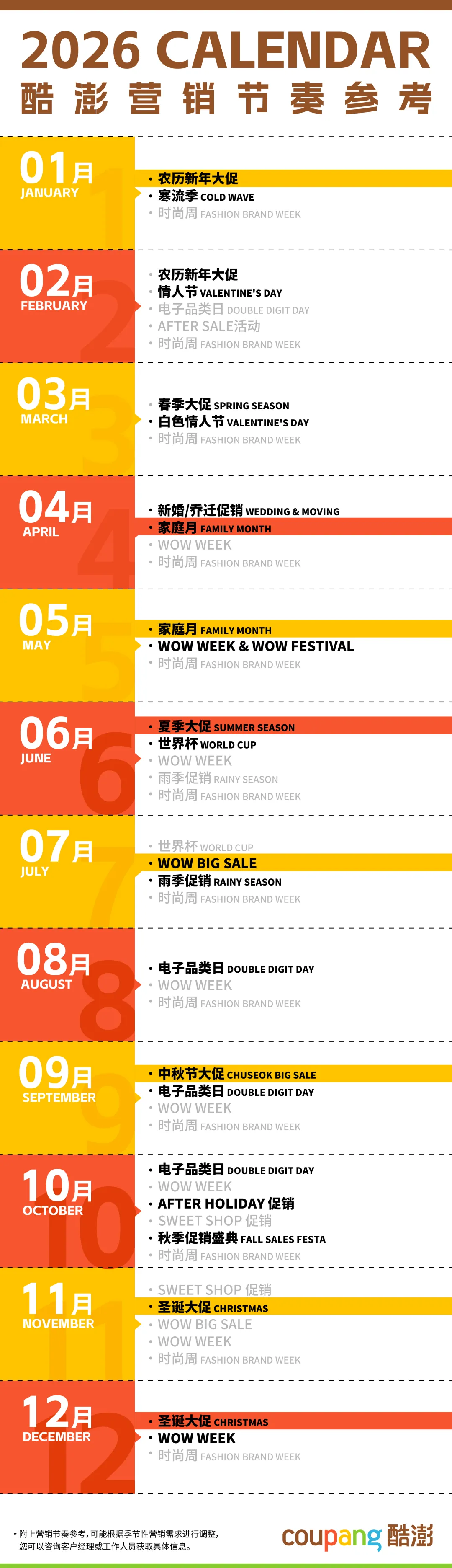 作为韩国人最常使用的购物APP之一,酷澎始终致力于为商家提供确定性增长动能。小编为你带来2026酷澎全年营销节奏参考助你梳理全年营销战略节奏,锁定蓝海商机!