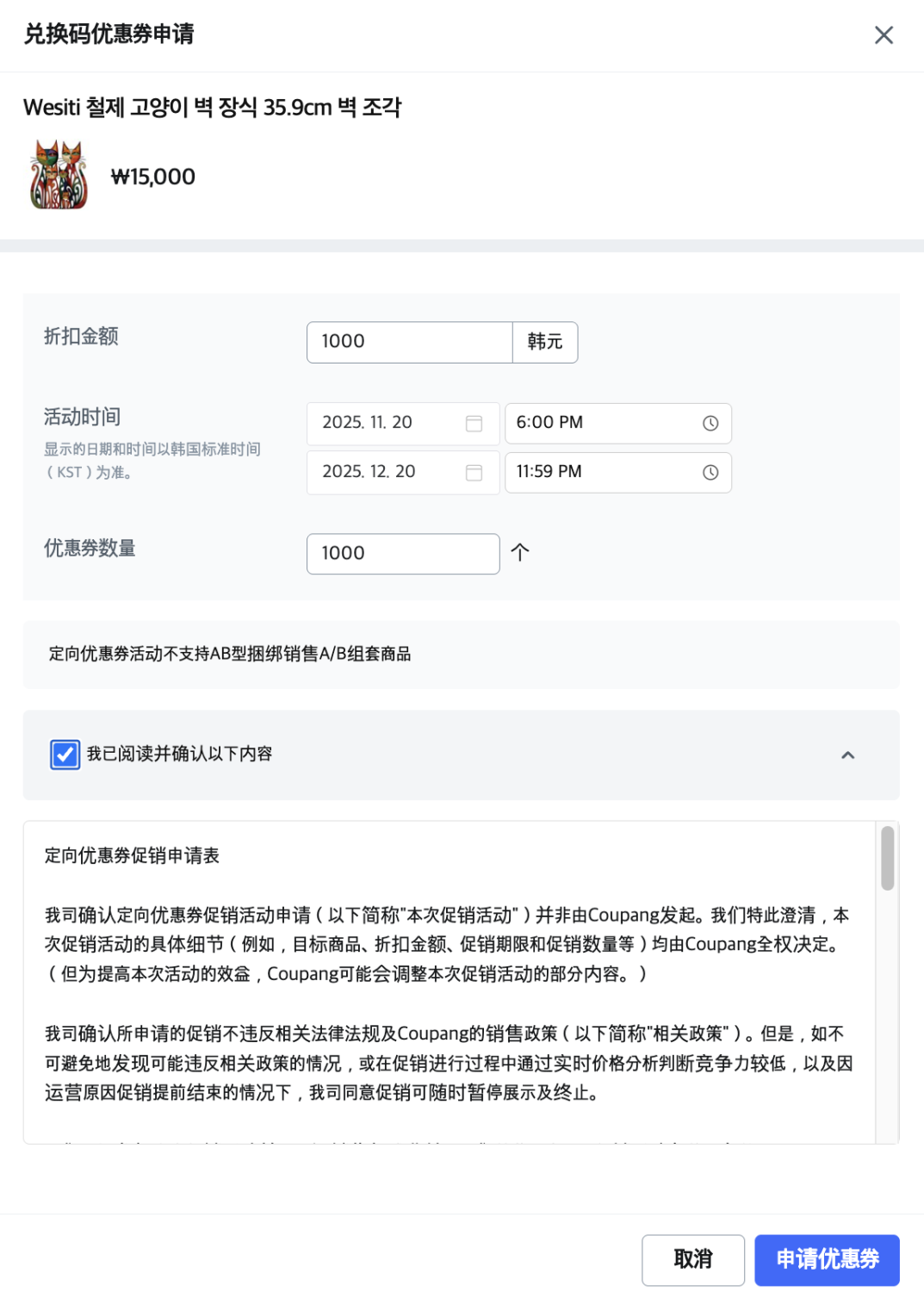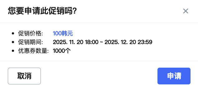 卖家点击接受条款和申请优惠券后,系统会和卖家再次确认优惠券的信息,若确认无误后可以再次点击申请,则该优惠券将即刻生效。