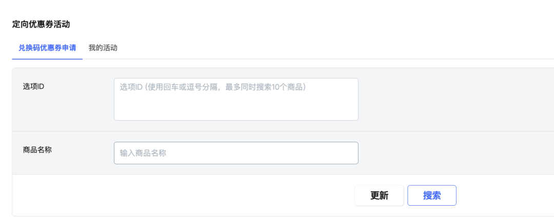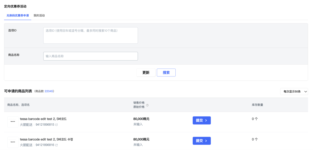 卖家可以在“兑换码优惠券申请”栏位中选择该优惠券的适用商品列表并点击提交,也可以通过搜索选项id来快速找到对应商品,(只是多个选项id同时搜索,需要用英文字符,隔开选项id即可),或者通过搜索商品名称来快速找到对应商品。