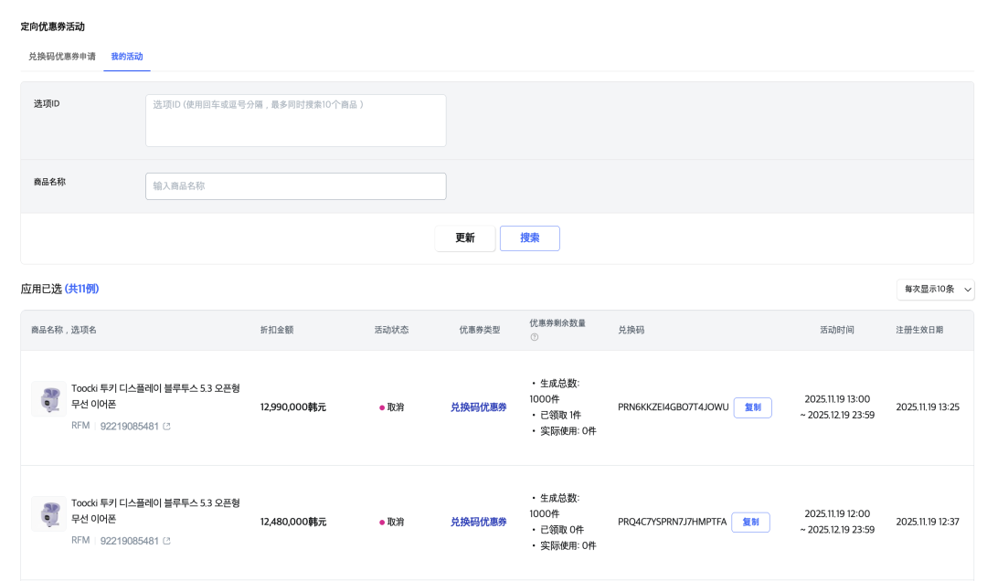 卖家可以选择兑换码优惠券类型进行申请创建;之前已经创建完成的优惠券可以在【我的活动】中进行查看。