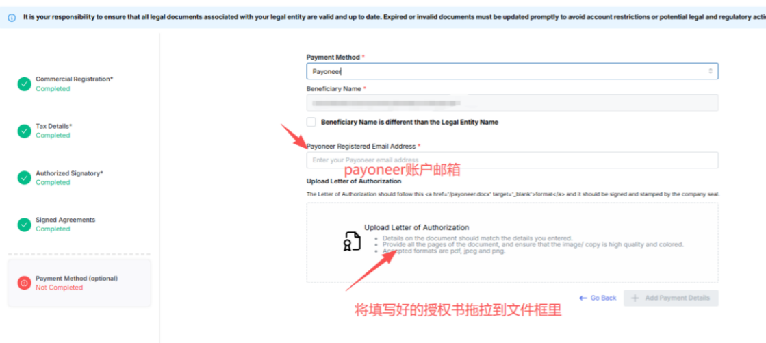 上传已填写并加盖公章的 授权书(需从Noon提供的链接下载模板)。