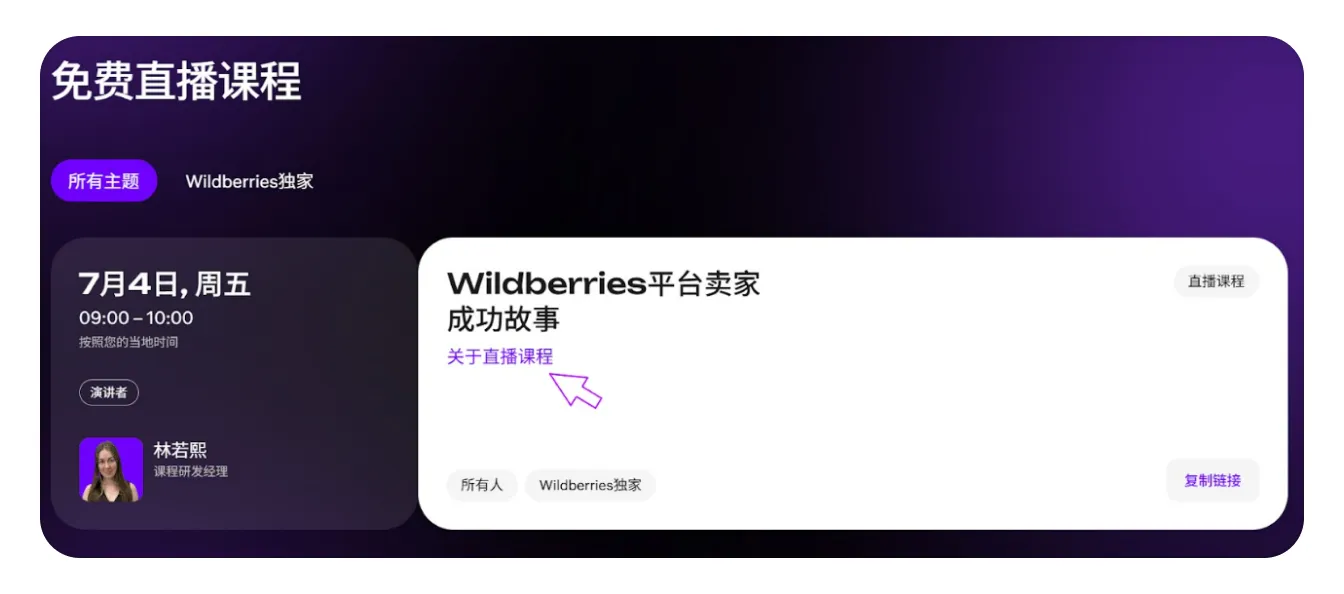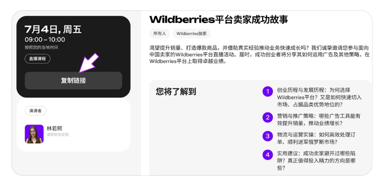 在“免费直播课程”板块选择即将举行的直播,点击“关于直播课程”进入该活动页面,在活动日期和时间预告下方点击“复制链接”按钮,即可复制该场直播在钉钉上的链接;
