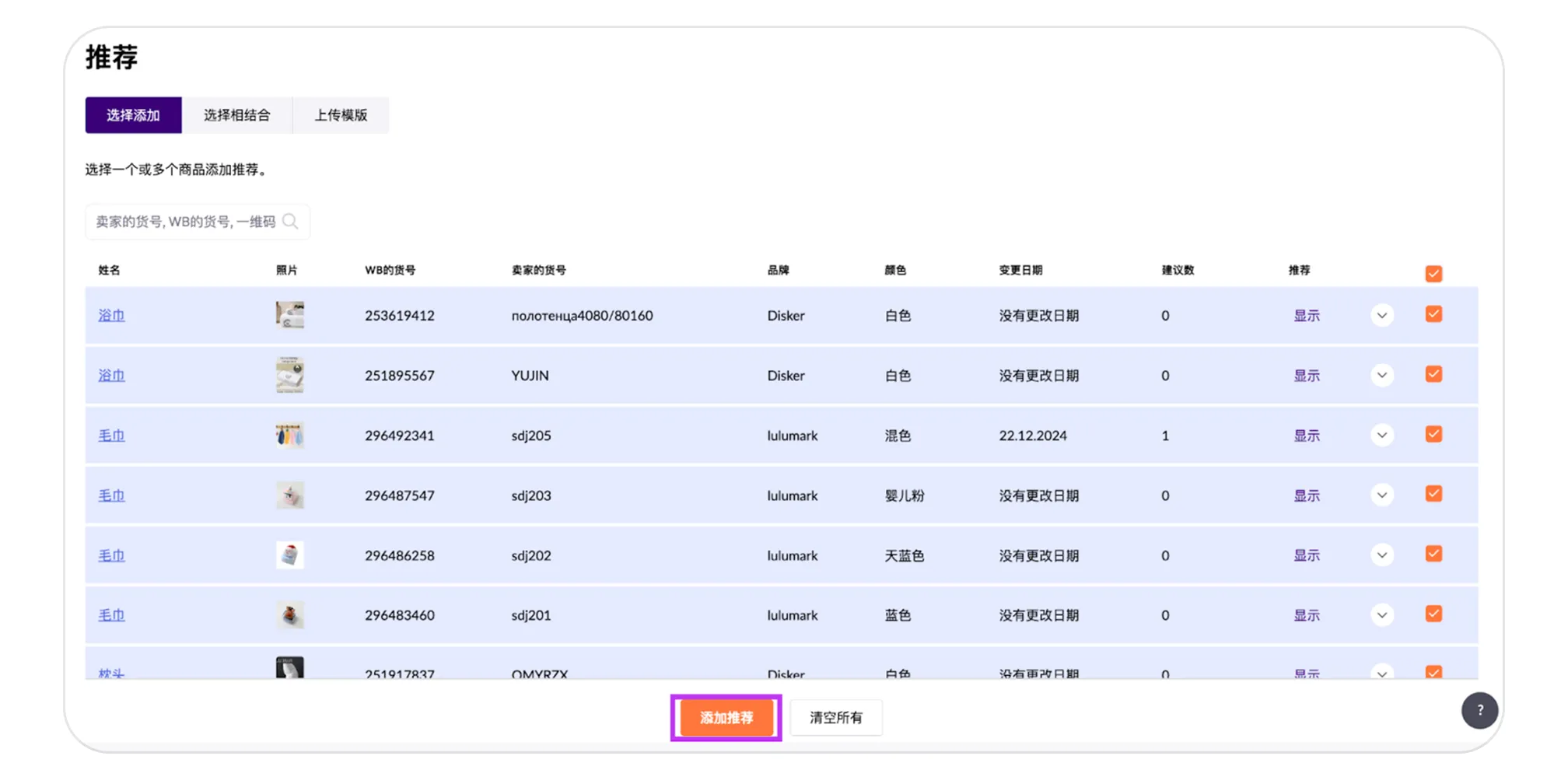 第 2 步:在商品右侧勾选一个、多个或全部商品,然后点击“添加推荐”。