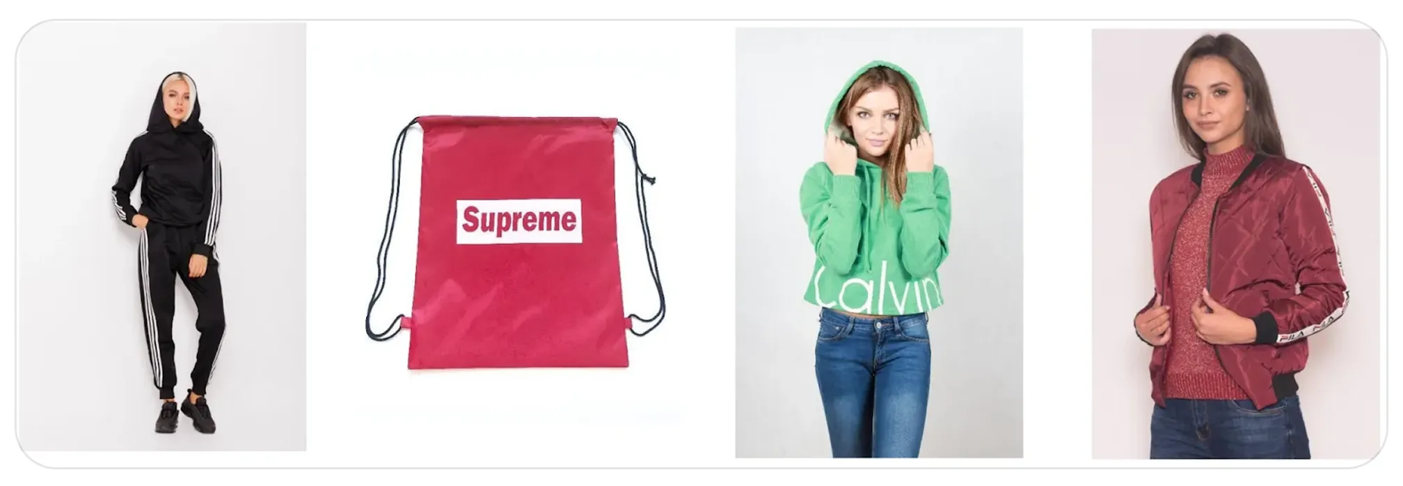 商品详情页不得使用带有他人商标的服饰或配饰照片,也不得使用外观仿制品或设计方案。