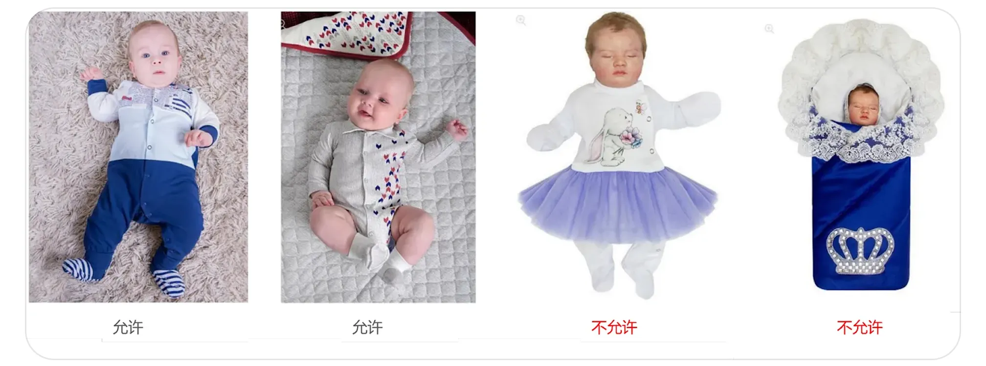 如果决定拍摄婴幼儿服装,照片中的小模特应表现出兴趣和愉快的表情。不允许拍摄婴儿睡着或闭眼的照片。