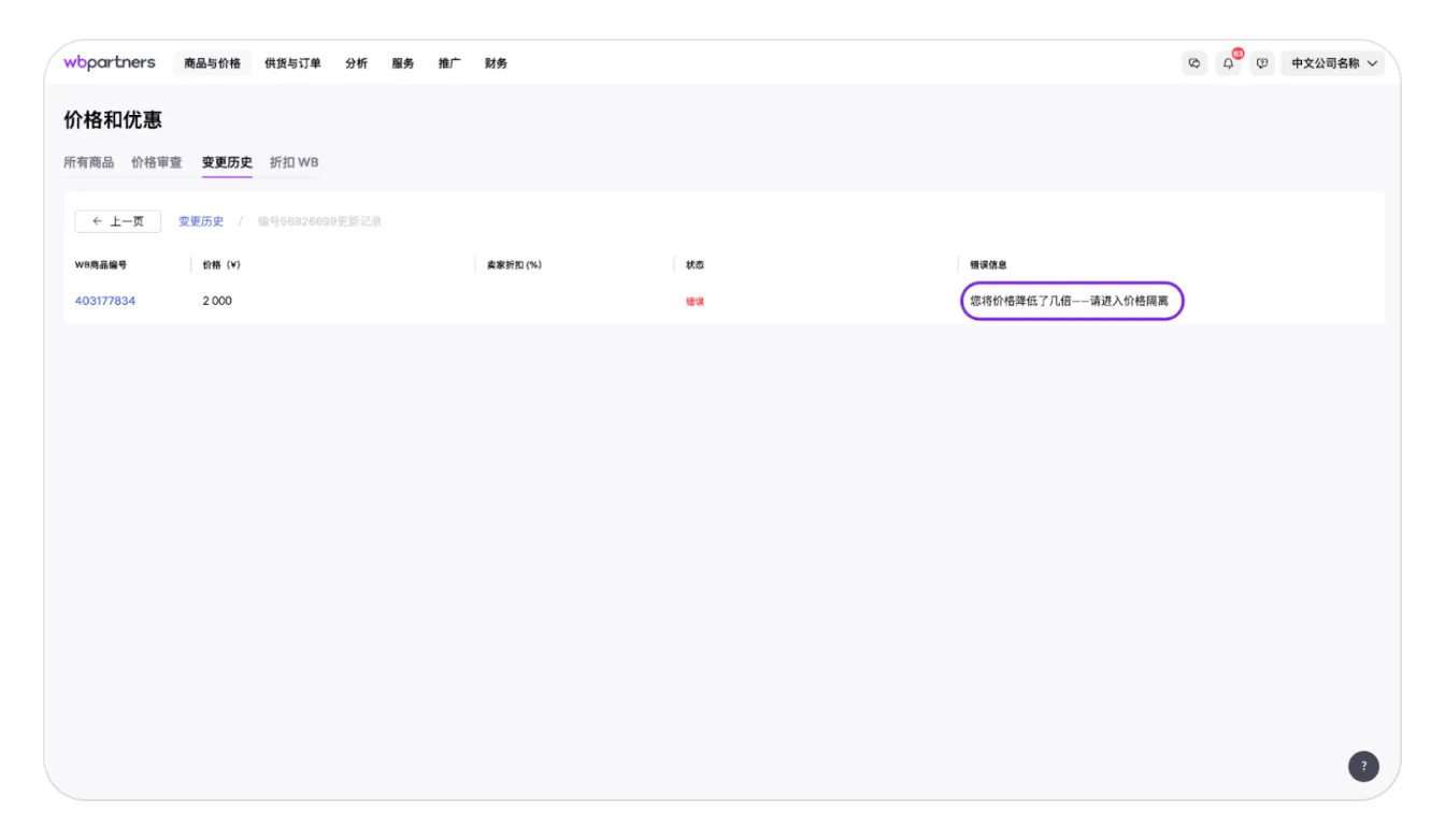 点击所需的行,查看哪些商品的价格已更新以及哪些商品出现了错误。