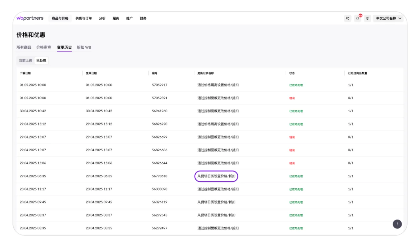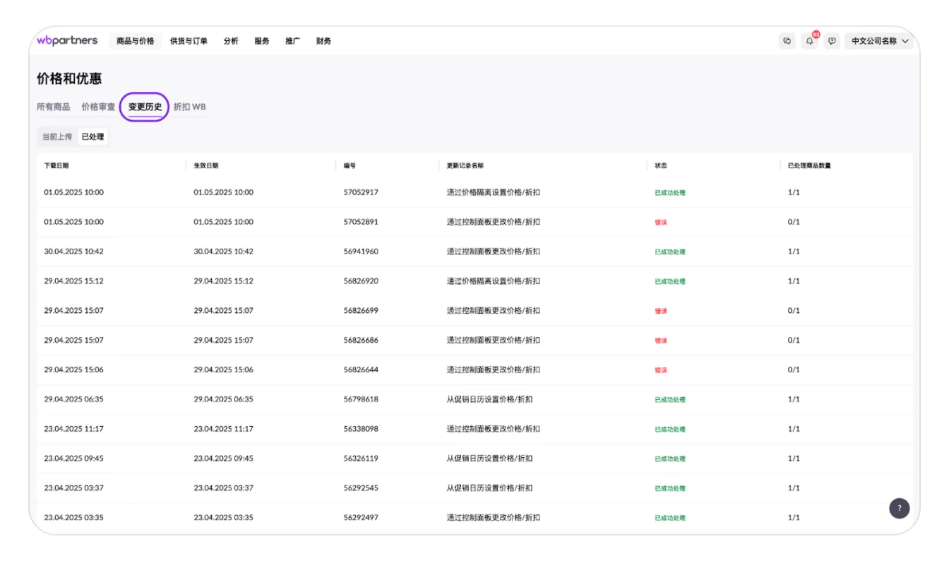 在您更改价格或折扣后,请转到“更改历史”选项卡,并在“已处理”选项卡中查找您的更新记录。