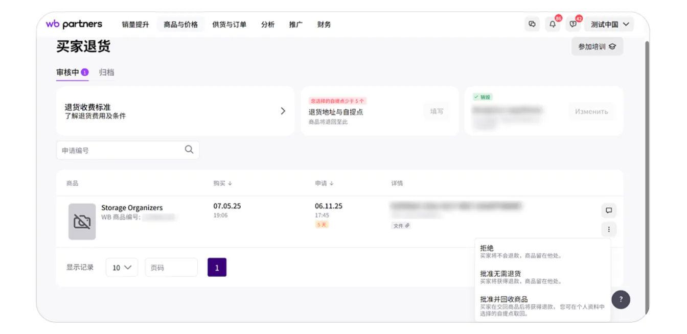 核准和提取货物 — 在这种情况下,商品将退回到俄罗斯的自提点以进行退货处理。如果商品是从中国仓库发货的,则将退还给在“海外”字段中指定的合作伙伴。