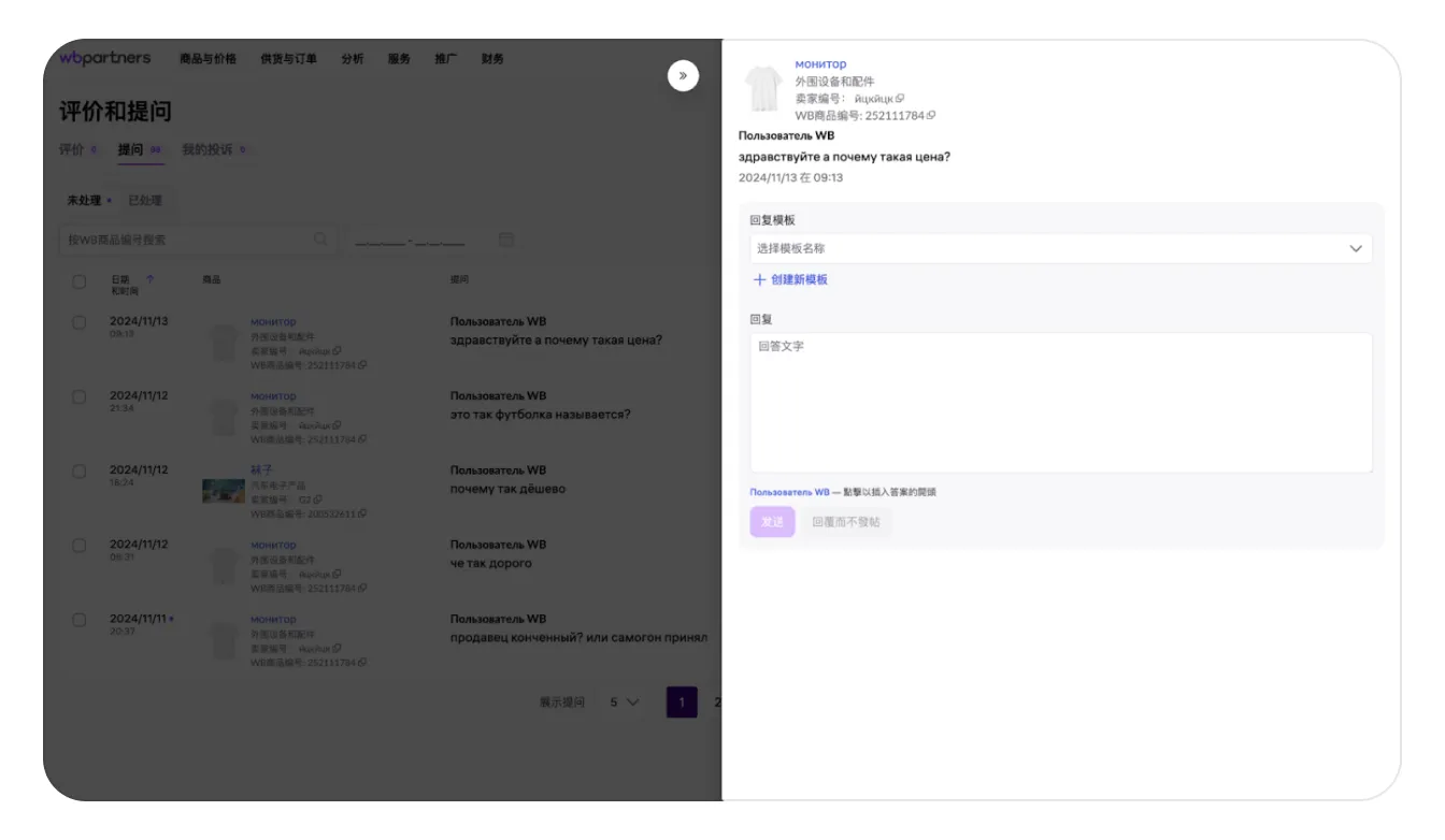在未处理问题列表中点击需要回答的问题行将打开回答买家的表单: