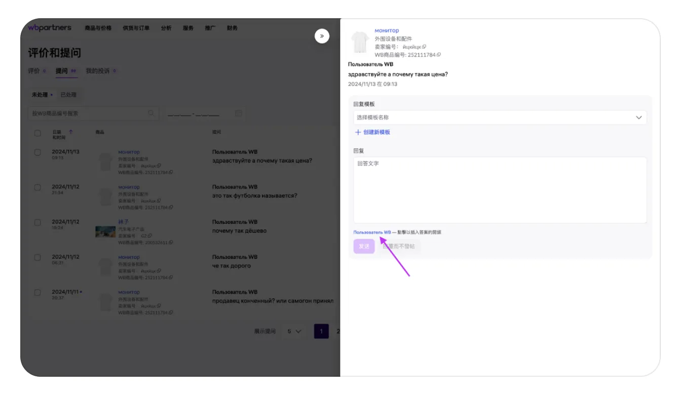 可以在回答开头自动插入买家姓名。它以蓝色显示在文本输入框下方。点击即可插入。