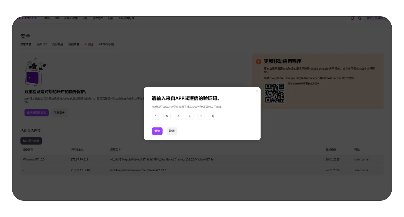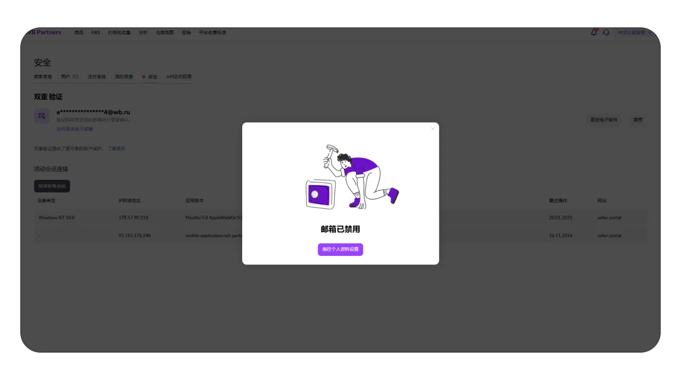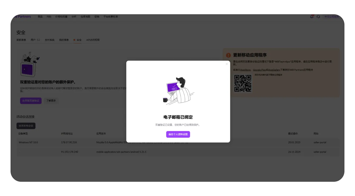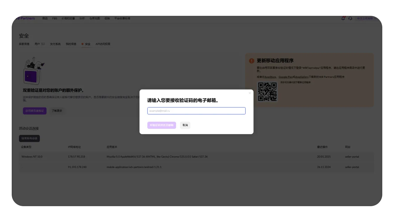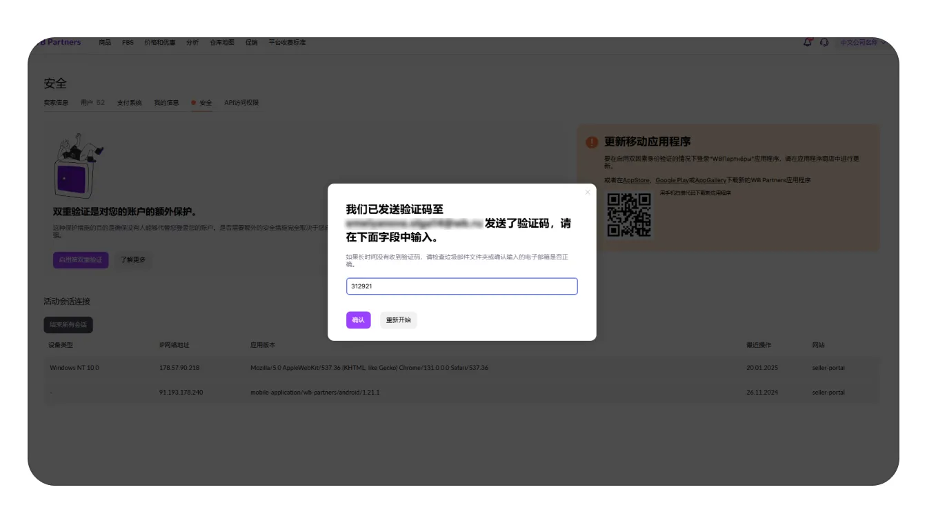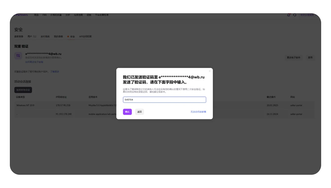 登录您新的电子邮箱,打开来自Wildberries的邮件并复制验证码。返回到卖家后台,将验证码粘贴到表单中,然后单击“确认”。