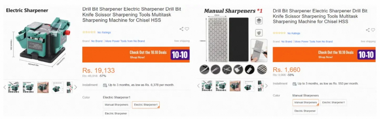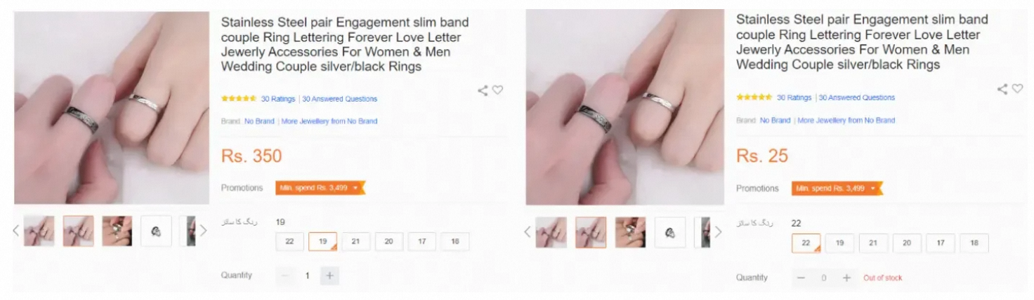 图示中的商品有多种变量型号,其中#22价格设置为 Rs.25.且无可售库存,其他变量为正常售价 Rs.350
