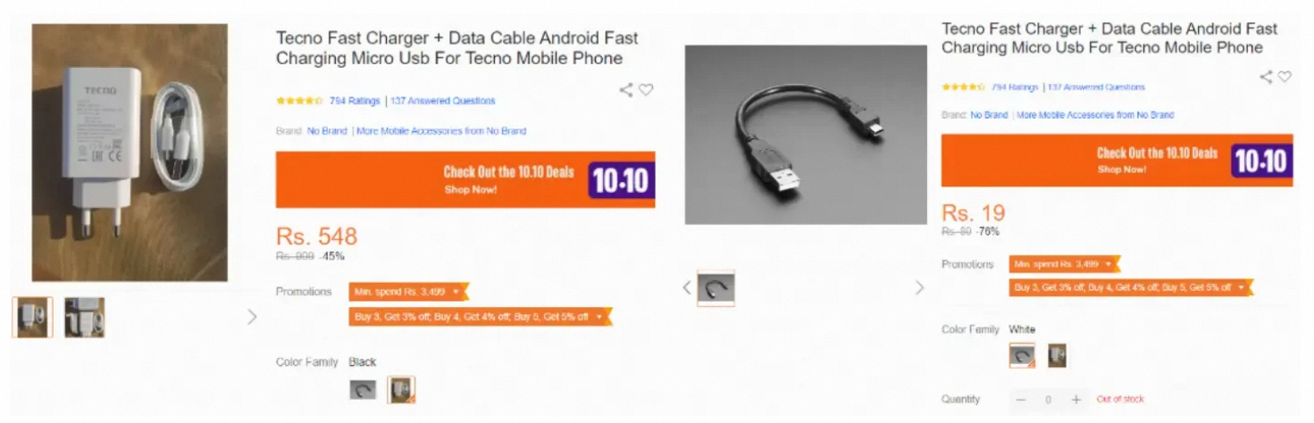 图示中的充电头套装和单一充电线作为变量设置,单独充电线的价格明显地域充电器套装