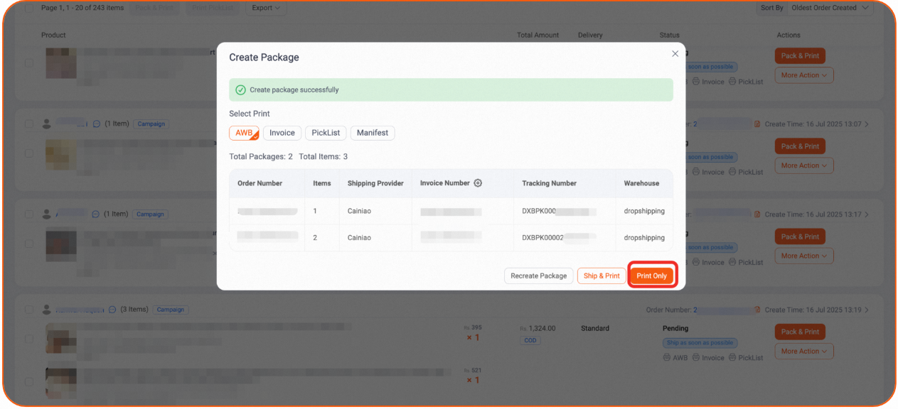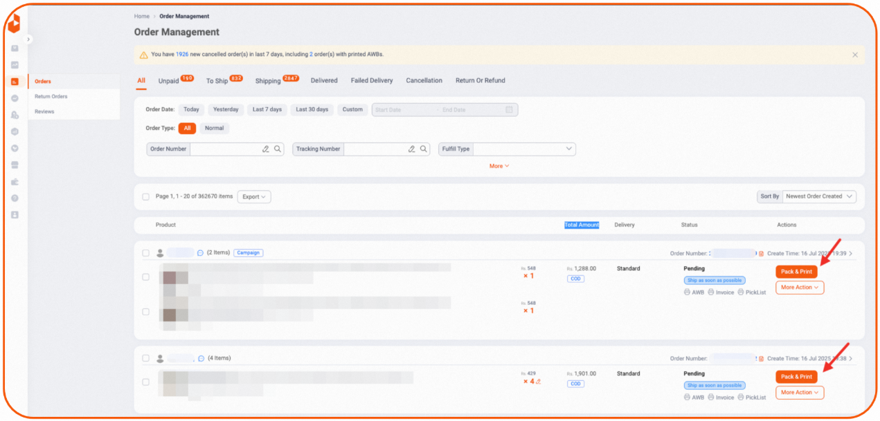 第一步:商家后台进入「Order Management」,筛选实付金额≥1000 PKR订单 , 点击 Pack & Print