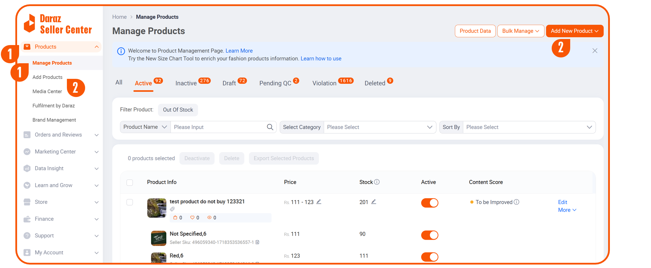 1► 登录Seller Center卖家中心,点击左侧导航菜单Products,下拉菜单中点击Manage Products跳转页面点击右上角 Add New Product 进入产品编辑页面,