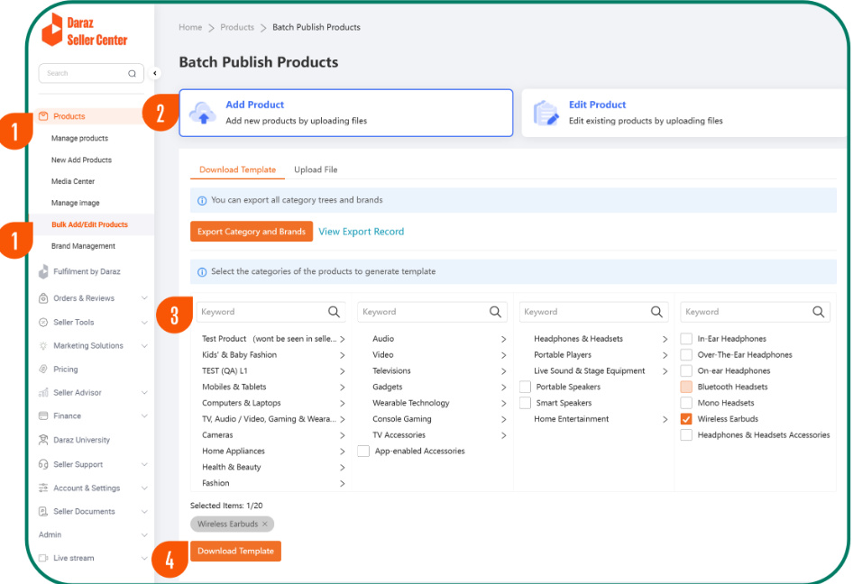 1► 登录卖家中心 Seller Center 点击左侧导航栏Products > Bulk Add/Eidt Products