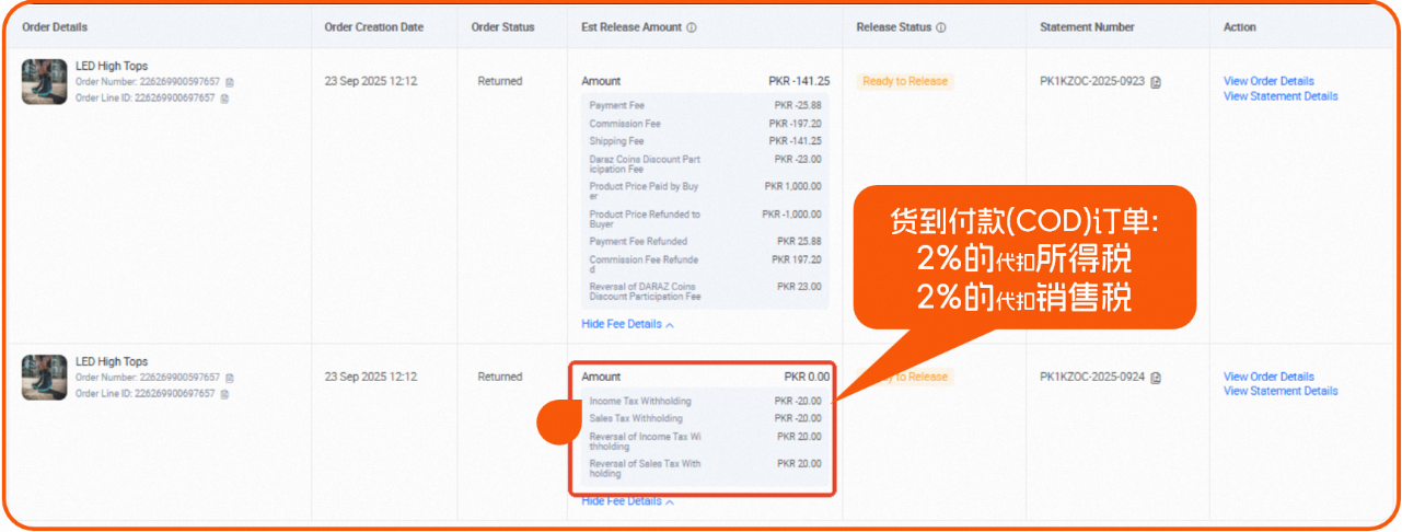 对于货到付款(COD)订单,平台会从商家应收款中扣除2%的代扣所得税和2%的代扣销售税。